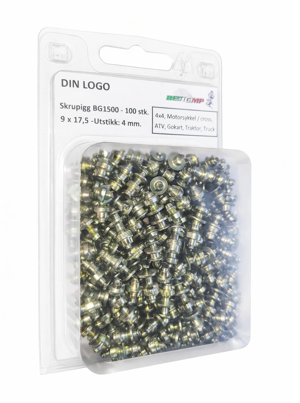 100 stk. pigger, pakket i blister. Verktøy (BG4500) bestilles separat.