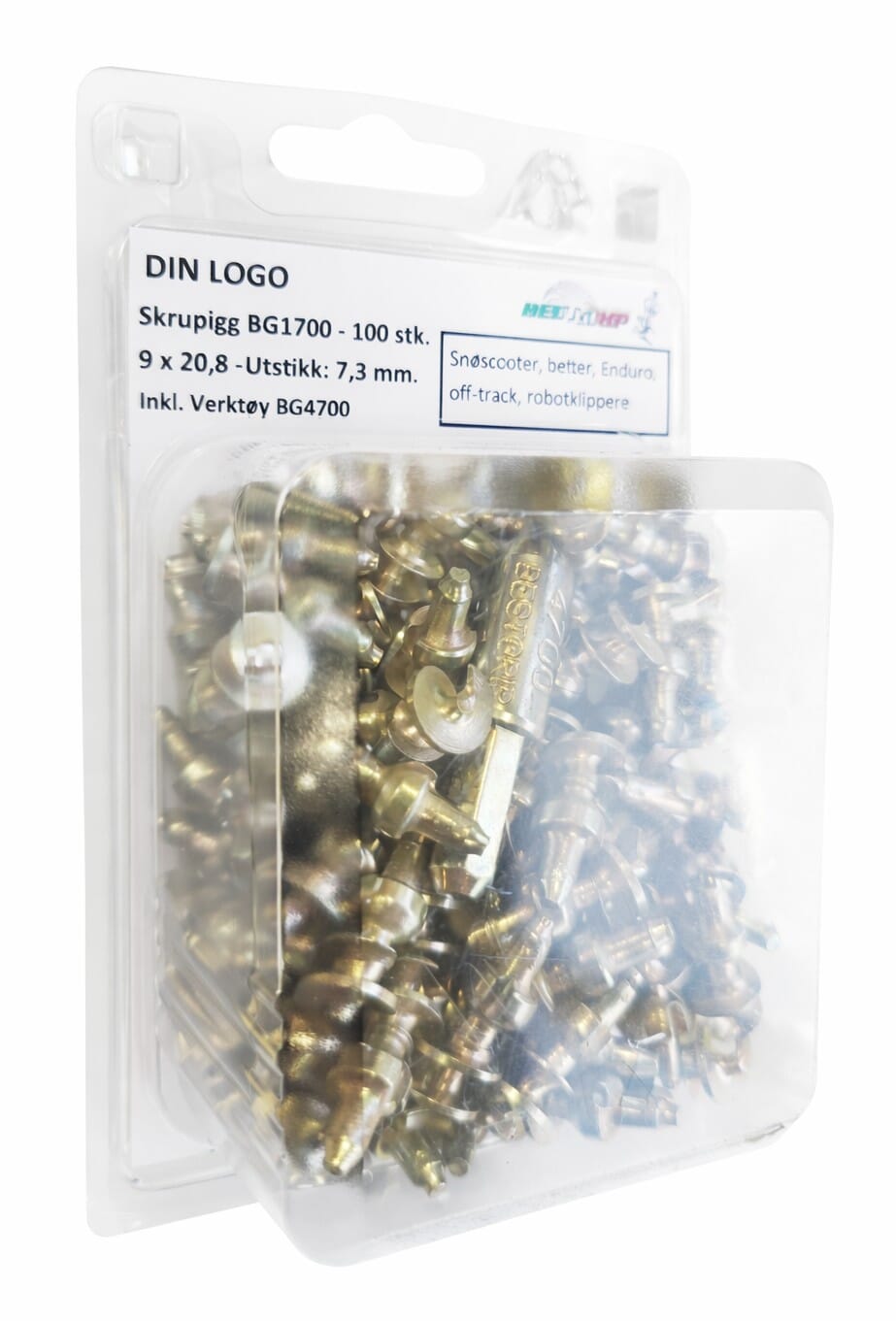 100 stk. pigger, pakket i blister. Inkl. verktøy (BG4700).
