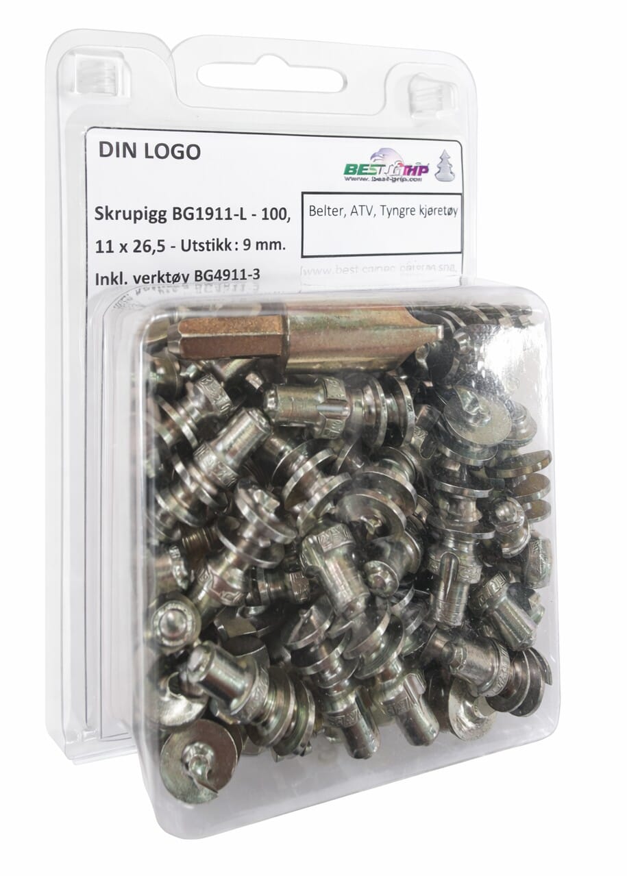 100 stk. pigger, pakket i blister. Inkl. verktøy (BG4911-3).