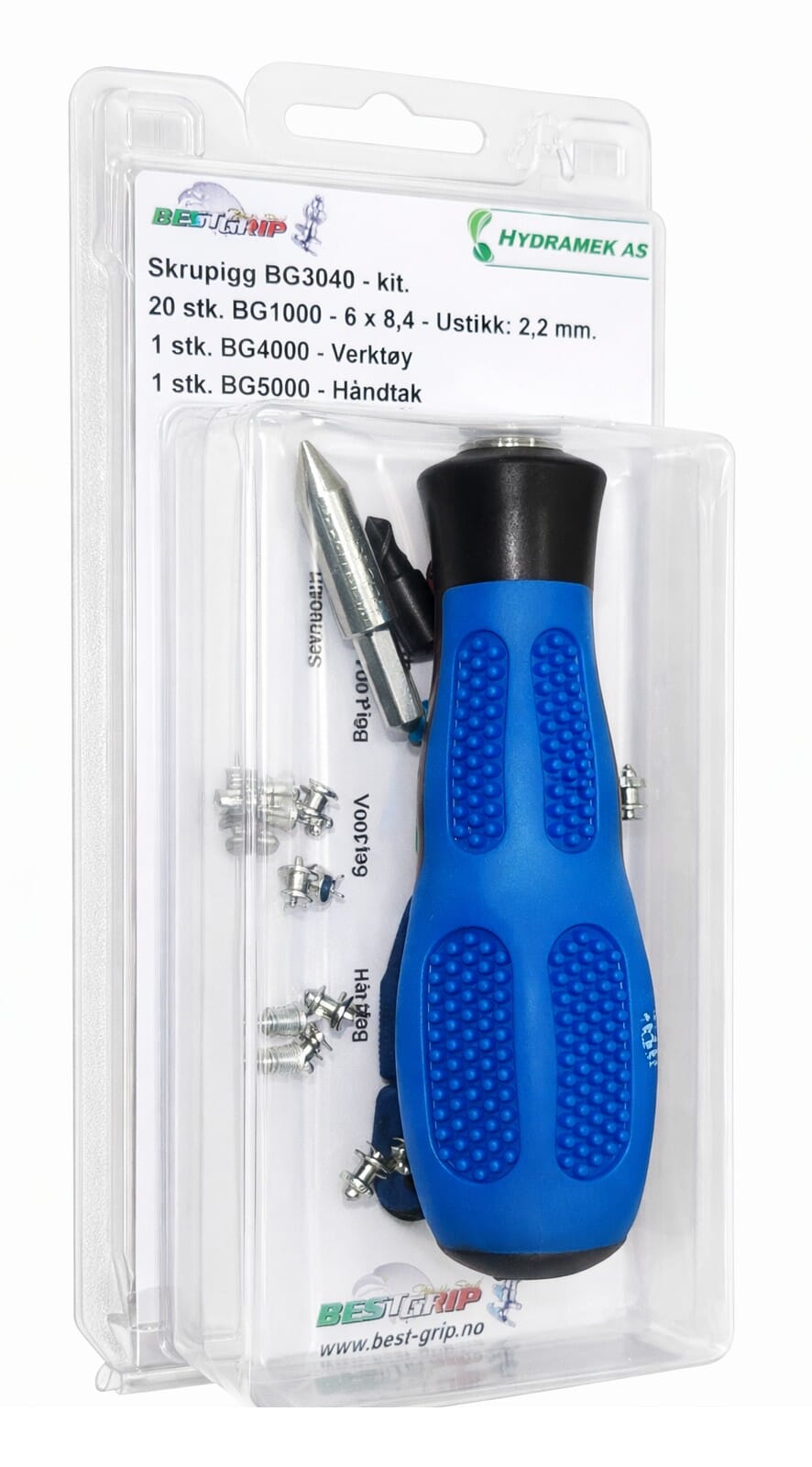 20 stk. BG1000 pigg. 1 stk. BG4000 monteringsverktøy. 1 stk. BG5000 monteringshåndtak.